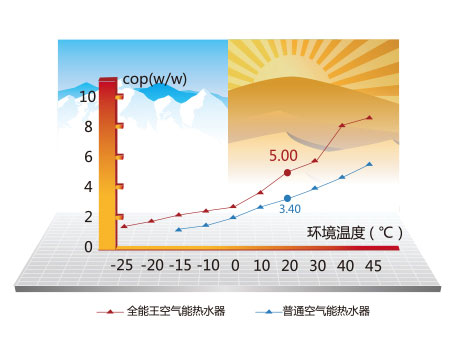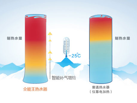 采用低溫智能增焓系統(tǒng),具有雙重動力,可在-25℃至45℃寬工況條件下制取熱水 |